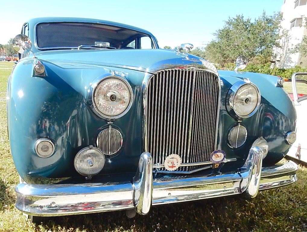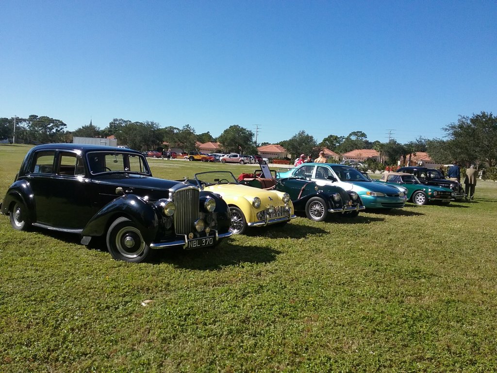 Sunny skies and the opportunity to formally welcome the club’s new members brought out 55 members who lined up their 30 vehicles in a grassy area behind the main condominium building. In a separate dining room upstairs, the group was treated to a flavorful three-course meal of lobster chowder, chicken Marsala, and topped by chocolate cake. The event doubled as a car show for appreciative Jacaranda Trace residents who browsed among the variety of British cars. It was cool in the morning, but by noon, coats were being shed.